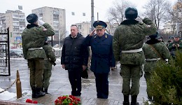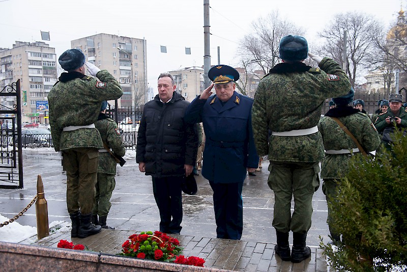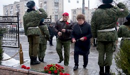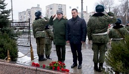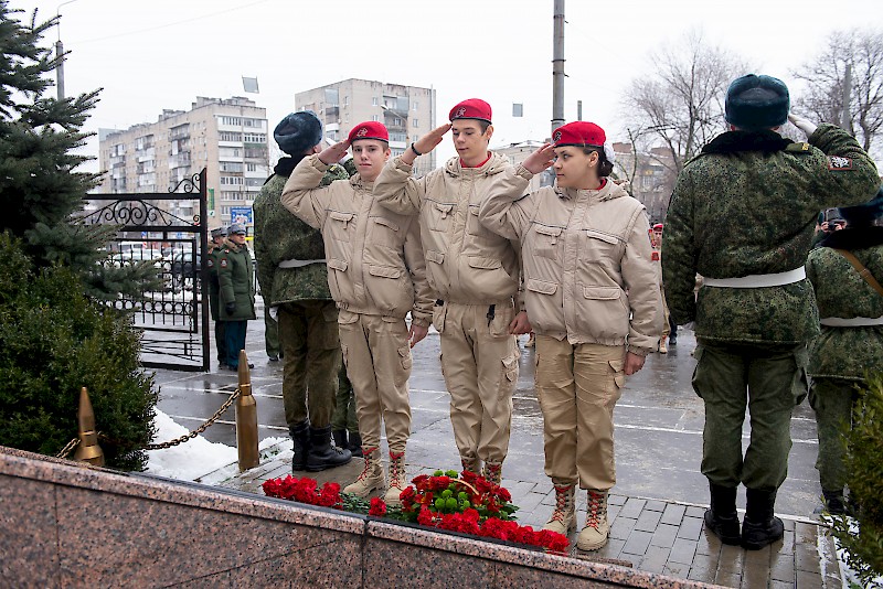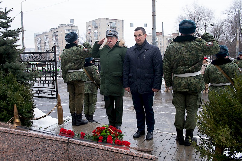 Перед началом мероприятия состоялось возложение цветов к Памятному знаку, посвященному героям Ростовского Стрелкового Полка Народного Ополчения.