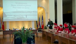 Модератор мероприятия проректор по воспитательной работе и социальному развитию Е.Г. Шепилова отметила: «Наша встреча проходит в преддверии празднования ростовчанами памятной даты. 14 февраля 1943 года наш любимый город был освобожден от фашистских захватчиков. В этом году мы отмечаем её в преддверии празднования 75 – й годовщины Великой Победы Каждый день этого года, Года памяти и славы, наполнен героическим звучанием, делами патриотически настроенной молодежи».
