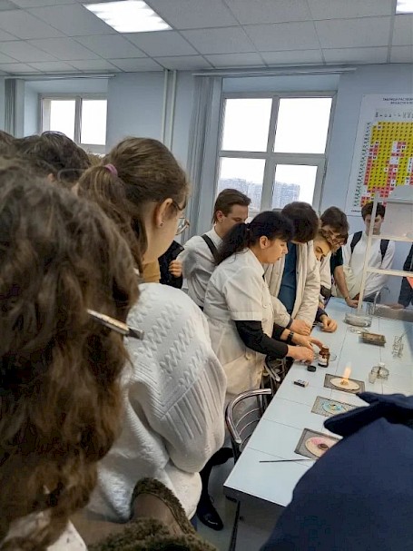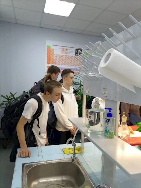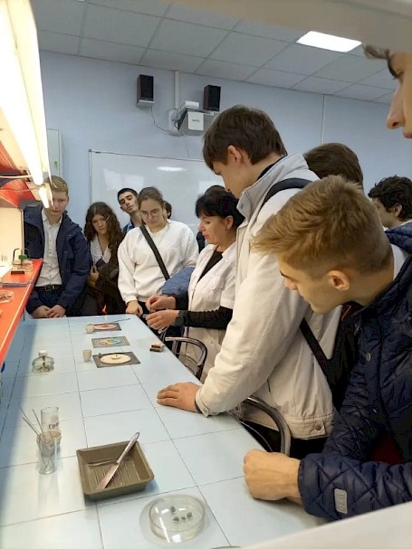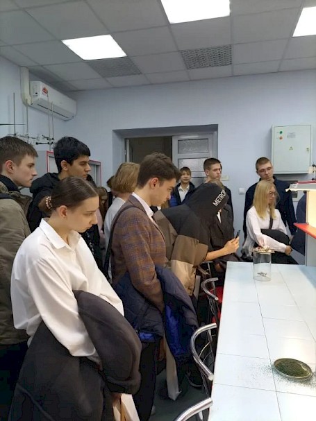С интересом ребята слушали рассказы о жизни студентов факультета, получили важную информацию об условиях приема в ВУЗ на указанную специальность, узнали о героях стройотряда и деятельности студенческой профсоюзной организации. Светлана Алексеевна Воляник, преподаватель химии РГУПС, показала увлекательные опыты во время экскурсии в предметную лабораторию.