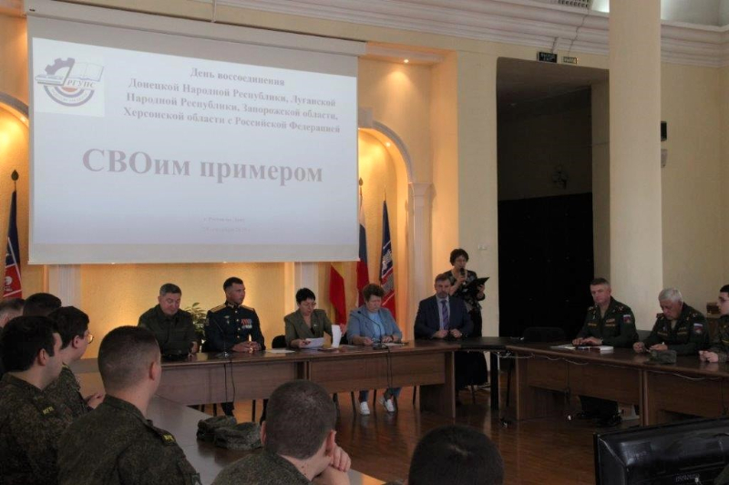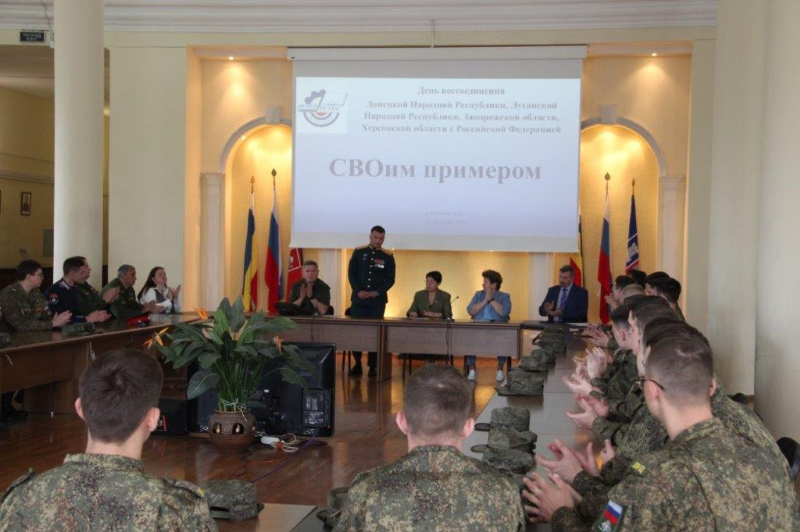 В рамках Всероссийской акции, приуроченной к празднованию Дня воссоединения Донецкой и Луганской Народных Республик, Запорожской и Херсонской областей с Российской Федерацией, в университете прошла встреча «СВОим примером» с участниками специальной военной операции, принимавшими участии в освобождении Донбасса и Новороссии.