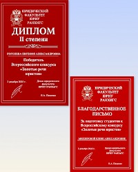 3 декабря 2025 г. Гоголева Евгения студентка гр. ПУБ-2-34 приняла участие во Всероссийском конкурсе «Золотые речи юристов» организованном юридическим факультетом ЮРИУ РАНХиГС г. Ростов на Дону, где по результатам конкурса заняла 2 место, выступив с фрагментом речи Фёдора Плевако по делу о краже серебряного кофейника (научный руководитель Миллерова Е.А.).